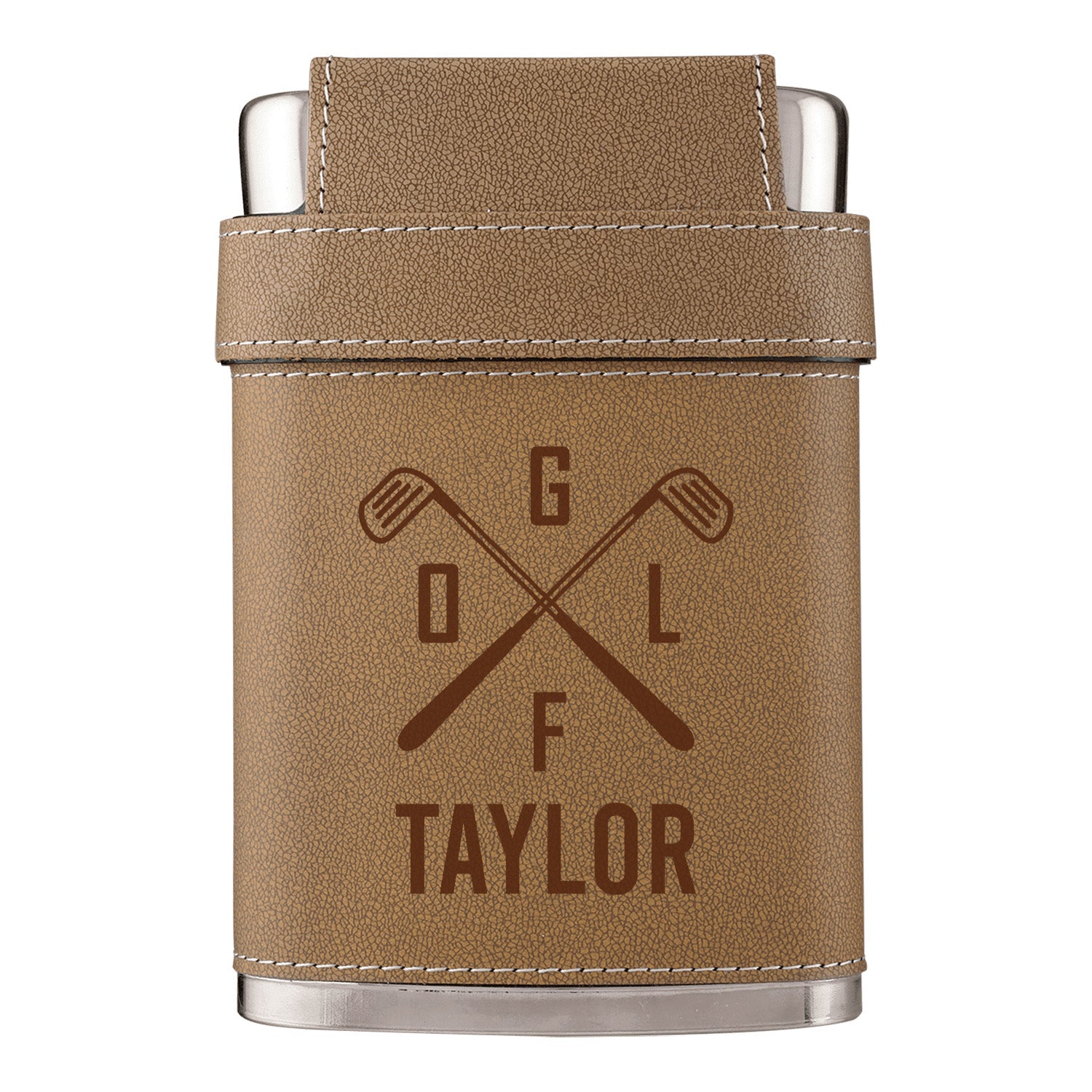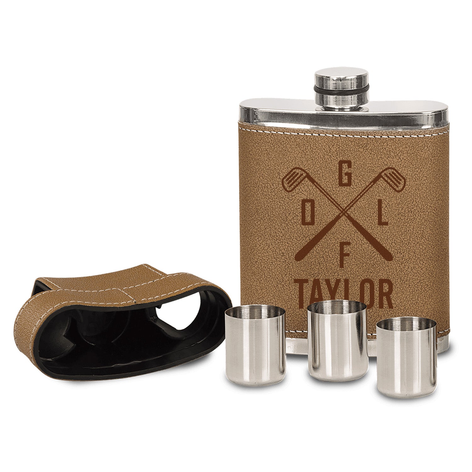 Our 7oz Personalized Leather Flask Kit includes 3 stainless shot glasses that are stored on top with a leather cap. Our lasers burn the brown leather surface revealing your custom design. Shot glasses are not engravable. When the lid is attached, the middle shot glass sits over the flask lid. The flask lid screws on & off, it does not have a permanent attachment. Made of faux leather and stainless steel.